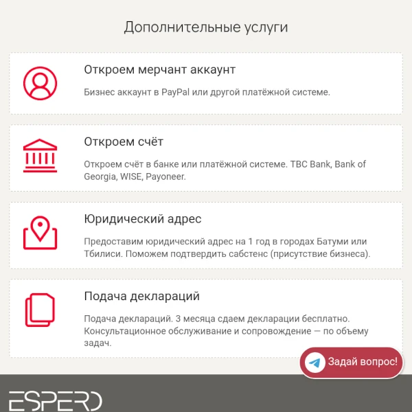 Команда Espero Group внимательно выслушала мои потребности и помогла мне выбрать наиболее подходящий тип бизнеса. Они предоставили мне исчерпывающую информацию о различных вариантах регистрации, позволяя мне принять обоснованное решение.